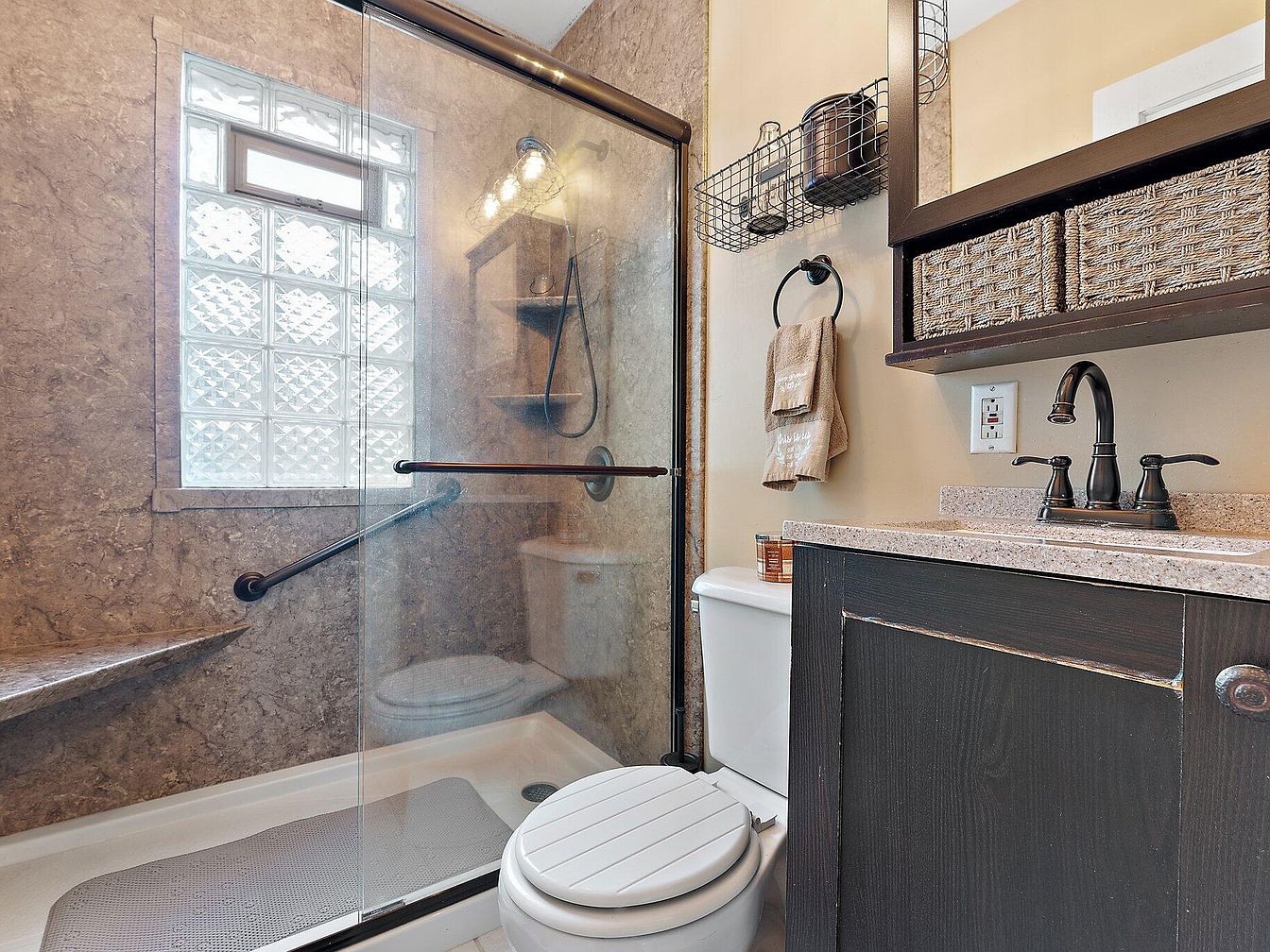 This bathroom features a compact yet functional design with a focus on neutral, earthy tones. The walk-in shower is enclosed by clear glass sliding doors, showcasing a textured stone wall and a built-in bench. A glass block window allows ample natural light to filter in while maintaining privacy. The dark wood vanity contrasts with the lighter countertop and walls, adding depth to the space. Above the sink, a mirror with built-in wicker basket storage provides both style and practicality. Matte black fixtures, including the faucet, towel ring, and shelving, complement the overall warm, rustic aesthetic.