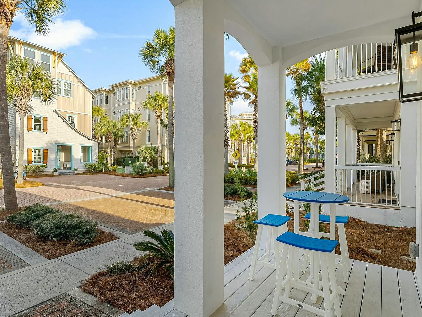 This inviting front porch features crisp white architectural elements with elegant arches that frame the outdoor seating area. The small table accompanied by four stools is painted white with bright blue tops, adding a cheerful coastal touch. The porch overlooks a charming street scene lined with palm trees and light sandy landscaping, consistent with a beach-inspired aesthetic. Nearby homes display soft, neutral tones with touches of wood shutters and pastel accents, evoking a serene, coastal community vibe. The porch’s wood floorboards and minimalist lantern-style lighting contribute to a clean, airy atmosphere perfect for casual gatherings or morning coffee.