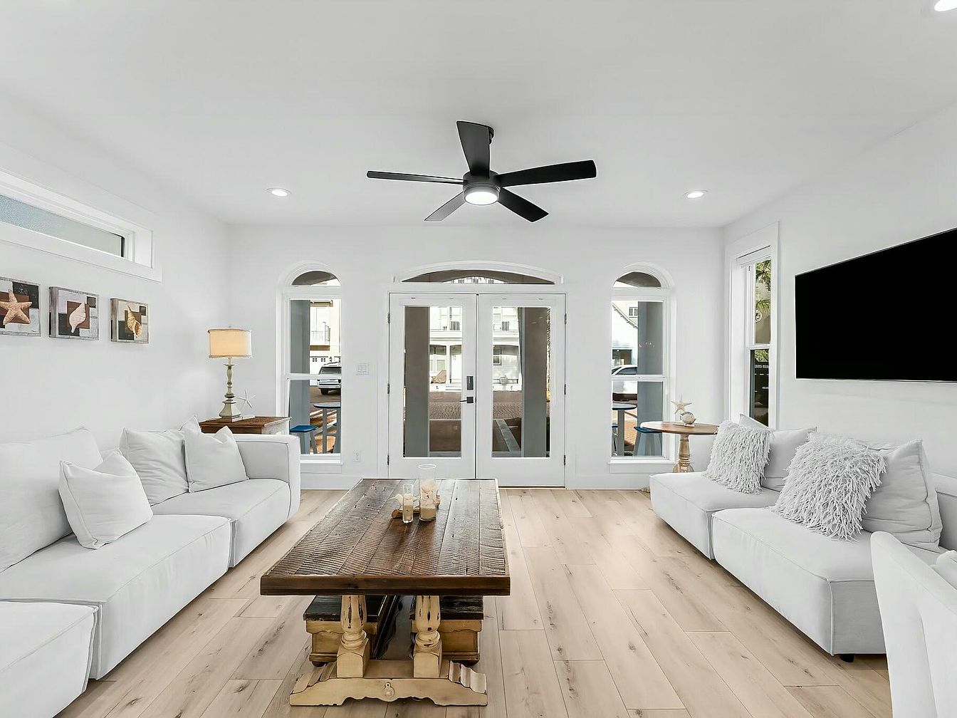 This living room features a bright, airy layout with light wood flooring that enhances the fresh, coastal-inspired aesthetic. Two plush white sofas face each other, adorned with soft, textured pillows for added comfort. A rustic wooden coffee table with sturdy legs sits centrally, adding warmth and character to the space. The walls are painted crisp white, complemented by minimalist decor including three small, framed art pieces featuring sea-themed motifs. Large windows and French doors with elegant arched transoms bring in ample natural light. A sleek, black ceiling fan and a mounted flat-screen TV balance functionality with modern style.