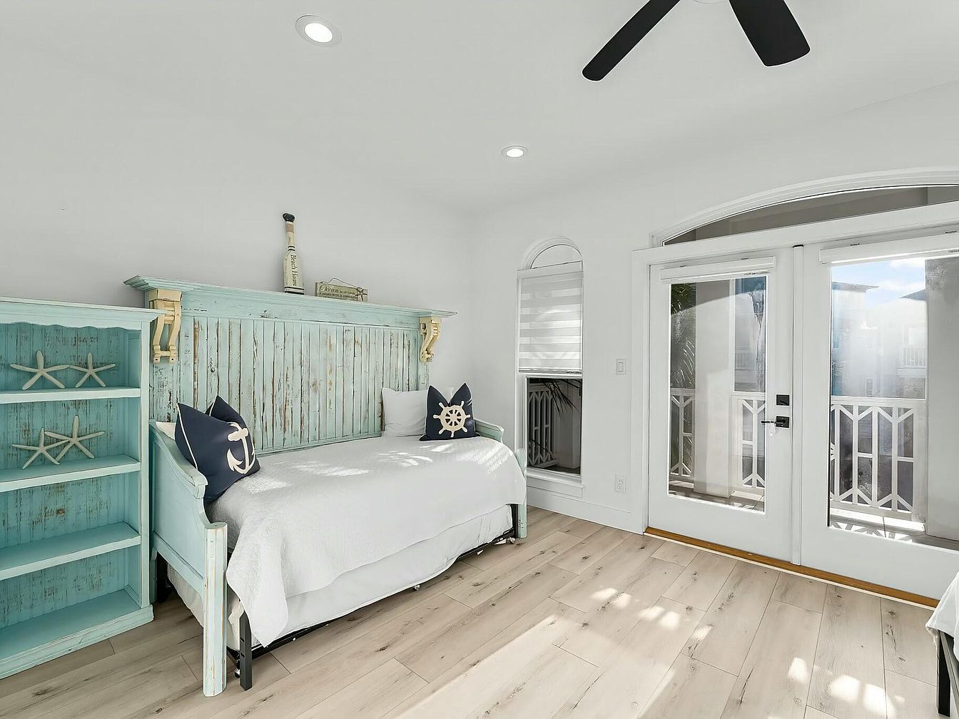This bright coastal-themed guest bedroom features a soft palette of white walls and light wood plank flooring, creating an airy, serene atmosphere. The distressed pale turquoise daybed with matching shelving adds rustic charm and a beachy vibe, enhanced by nautical-themed throw pillows. French doors with a white frame open to a balcony, allowing natural light to flood the space and offering outdoor access. An arched window with a light-colored shade complements the room’s architectural details. Recessed ceiling lights and a black ceiling fan provide functional, modern touches to this inviting retreat.