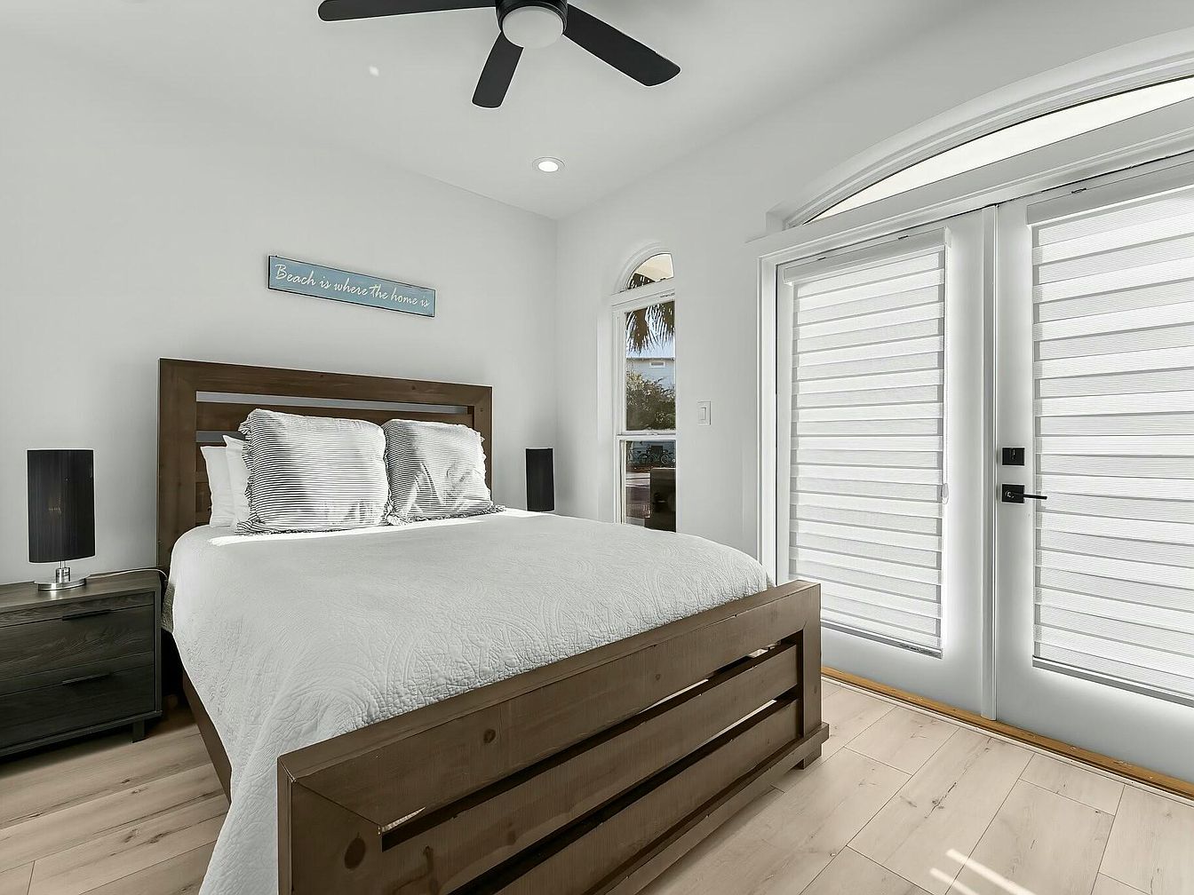 This peaceful bedroom features a clean, minimalistic design with a calming white and neutral color palette. The bed, constructed of rich dark wood, serves as a strong focal point, complemented by matching nightstands with sleek black lamps. Light wood flooring adds warmth and texture while maintaining the airy ambiance. Natural light filters softly through white, layered window blinds covering a set of French doors, which provide direct access to an outdoor space. Architectural details include a small arched window and ceiling fan with modern black blades, enhancing ventilation and comfort while maintaining the room’s serene atmosphere. Above the bed, a charming sign reads “Beach is where the home is,” setting a relaxed coastal tone.