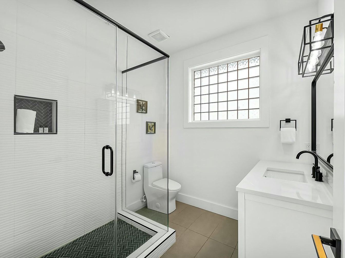 This bathroom features a clean, modern design with a focus on simplicity and functionality. The space is accented by a large walk-in shower enclosed by clear glass with black hardware for contrast. The shower wall tiles have a subtle wave texture in white, while the shower floor is laid out in a dark gray herringbone pattern. Opposite the shower, sleek white cabinetry under a white countertop supports a black matte faucet and rectangular sink. A large framed mirror and industrial-style light fixture enhance the vanity area. A frosted glass block window allows natural light while maintaining privacy, complementing the minimalist white walls and beige tile flooring.