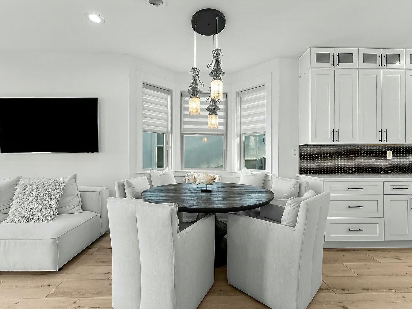 This bright, open breakfast nook is framed by a trio of windows fitted with layered blinds, inviting ample natural light. A striking round dark wood table anchors the space, surrounded by plush, cushioned armchairs in soft white fabric, creating a cozy yet elegant seating area. Overhead, three pendant lights with intricate metal detailing and warm amber glass shades add an industrial touch while casting a soft glow. Adjacent cabinetry showcases a classic white finish with black hardware, complemented by a dark mosaic tile backsplash, creating a balanced contrast against the light wood flooring and predominantly white walls.