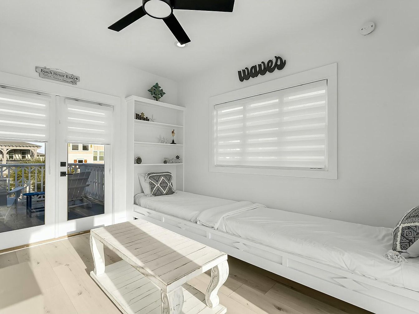 This serene coastal sitting nook features a long, built-in bench bed with crisp white bedding and decorative gray-patterned pillows, inviting relaxation. The wall behind the bed holds white shelves adorned with subtle coastal décor such as starfish and a wooden sign reading “Relax.” Natural light floods the space through large French doors leading to an outdoor balcony, paired with a window dressed in light-filtering horizontal blinds. The walls, ceiling, and furniture maintain a bright white palette, complemented by a light wood floor and a modern black ceiling fan, creating a fresh, airy ambiance.