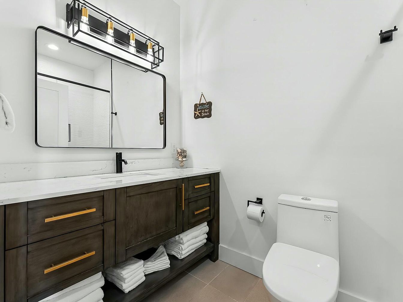 This bathroom features a sleek and modern vanity setup with a deep wood-toned cabinet that contrasts elegantly against crisp white walls. The countertop is a polished white surface with subtle marbling, crowned by a minimalist black faucet. Above, a large rectangular mirror framed in black complements the industrial-style lighting fixture with exposed bulbs housed in a black geometric frame. The under-cabinet open shelving holds neatly folded white towels, enhancing organization while adding softness. The toilet design is streamlined and contemporary. The monochromatic scheme, with black accents and wood warmth, gives this space a clean yet inviting aesthetic.