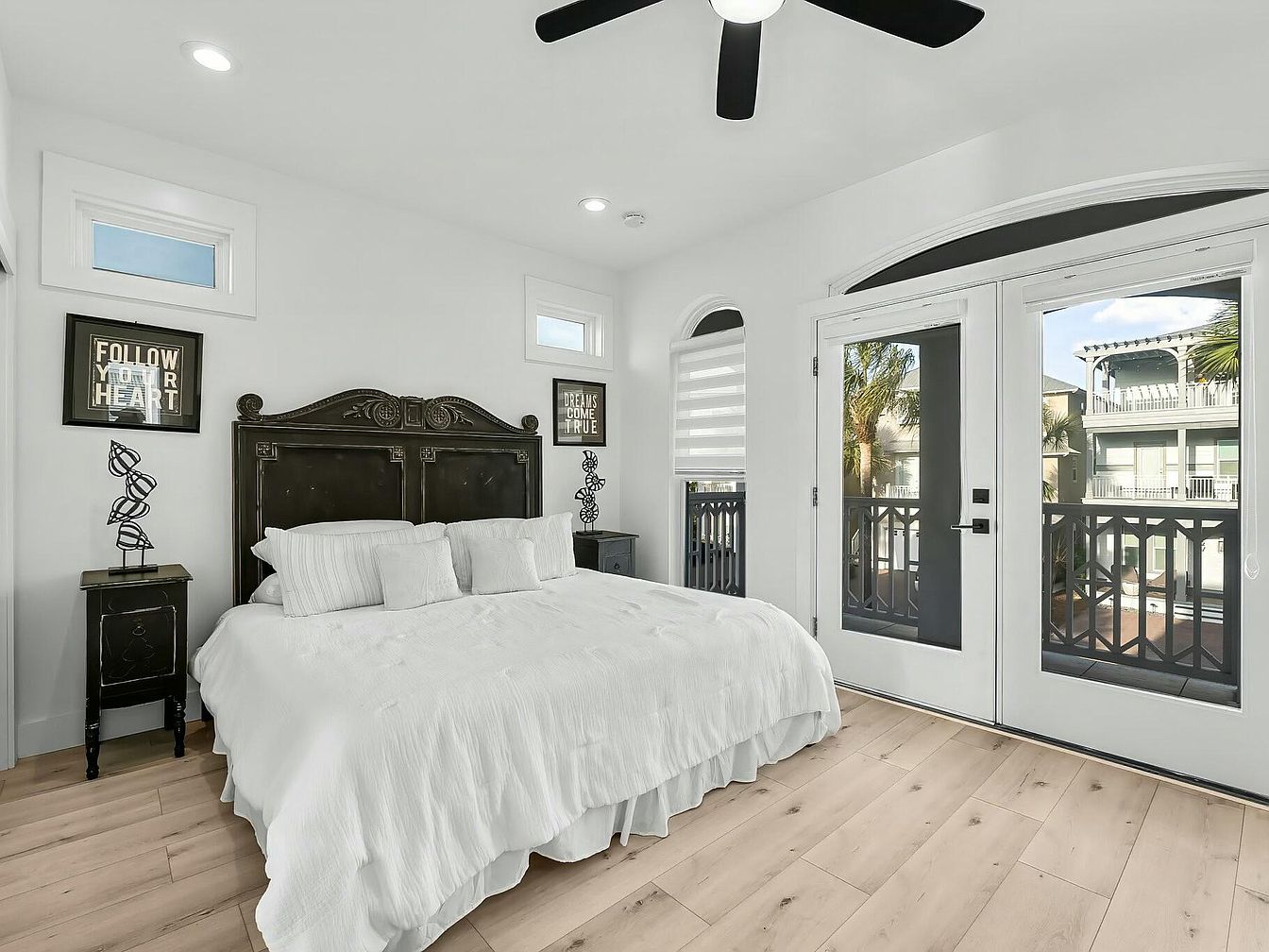 This serene bedroom features a large bed with an ornate dark wood headboard contrasting the crisp white bedding and walls. Flanking the bed are two matching dark wood nightstands each topped with modern sculptural lamps. Above each nightstand hang framed motivational prints, adding personality to the space. Light wood flooring enhances the airy feel, while recessed ceiling lights and a black ceiling fan provide functional lighting and cooling. French doors with a semi-circular transom above open to a balcony with black railing, offering a connection to the outdoors and neighboring homes, completing the coastal-inspired aesthetic.