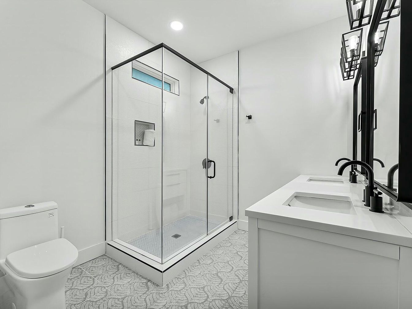 This bathroom combines sleek modern design with functional elements. The spacious walk-in shower is enclosed with clear glass panels framed in black metal, highlighting cleanliness and sharp contrast. Inside the shower, white tiles extend all around, accented by a small built-in niche with a subtle herringbone pattern for storage. Opposite the shower, a double vanity with a white countertop features undermount sinks and matte black faucets, complemented by large matching black-framed mirrors and industrial-style lighting. The light-colored patterned floor tile adds texture and warmth to the otherwise monochromatic and minimalist space, creating a balanced, airy atmosphere.