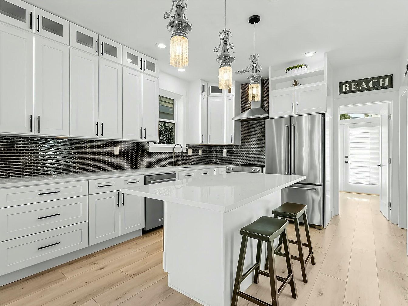 This kitchen features a bright, open layout dominated by white cabinetry with sleek black handles that complement the mosaic tile backsplash in dark shades. The large kitchen island, finished with a smooth white countertop, offers ample workspace and casual seating with two simple dark stools. Stainless steel appliances, including a double-door fridge and built-in oven with a modern hood, enhance the contemporary aesthetic. Light wood plank flooring adds warmth to the space, while three elegant pendant lights with crystal-like accents hang above the island. Subtle decorative touches like a “BEACH” sign hint at a coastal-inspired theme.