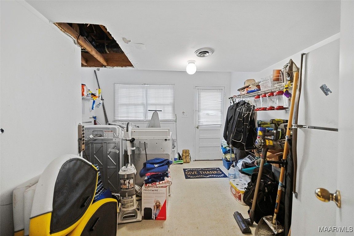 This utility space serves as a combined laundry and storage room, with a practical and somewhat utilitarian feel. White walls and a light beige floor help brighten the area despite its functional purpose. A washing machine and utility sink sit along the back wall beneath a window, providing natural light through closed blinds. The ceiling shows some wear with an exposed section revealing wooden beams. Shelving above holds various tools, supplies, and a rack for clothes or coats. Household essentials like a vacuum, paper towels, and cleaning equipment are neatly arranged, emphasizing organized, everyday utility.