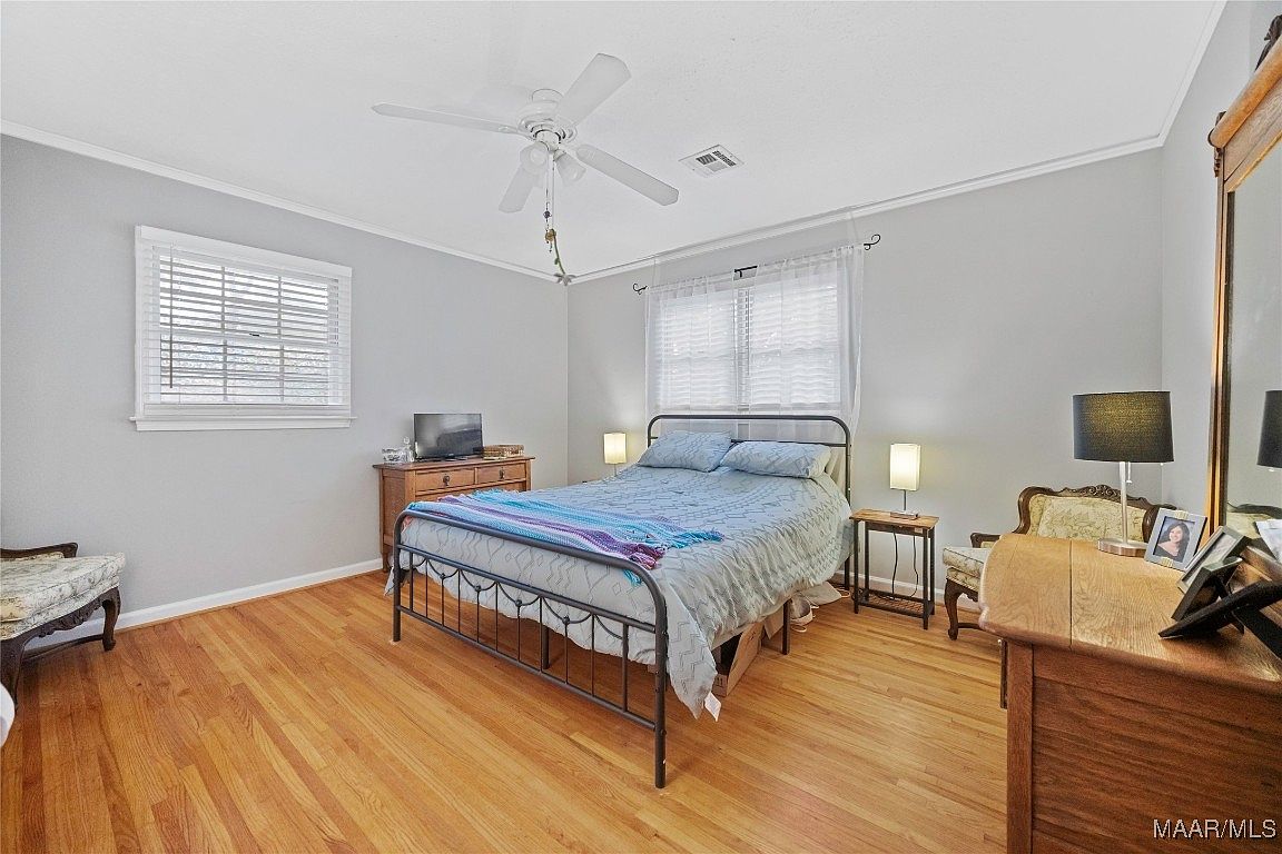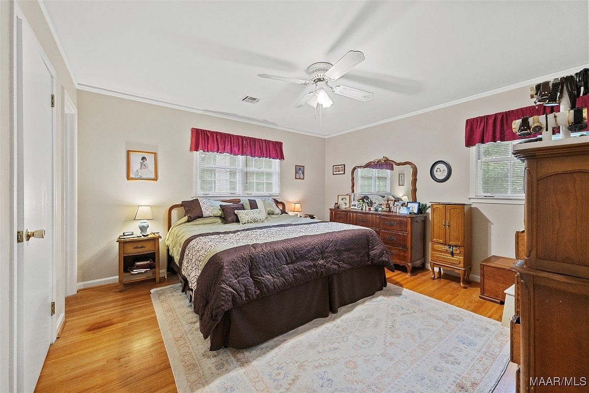 This master bedroom features a cozy layout with warm wooden flooring complemented by a large area rug in soft neutral tones. A king-sized bed dominates the center, layered with rich, dark bedding contrasted by lighter pillows. The walls are painted a soft beige, enhanced by white trim and crown molding, maintaining a calm and neutral palette. Two windows with deep red valances bring natural light into the room. Classic wooden furniture, including a dresser with an ornate mirror, nightstands, and a small wooden cabinet, evoke a traditional, timeless aesthetic. A white ceiling fan with lights adds a functional element to the room.