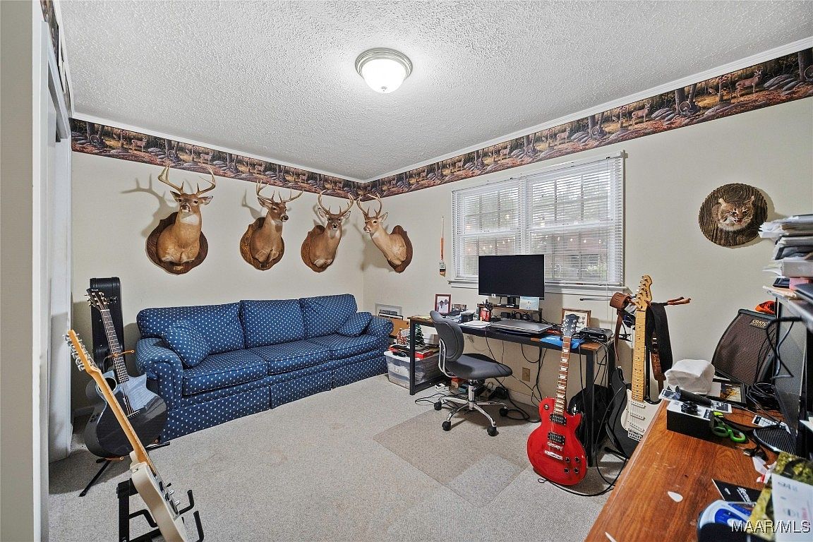 This cozy multi-purpose room combines a home office and music space. A blue polka-dotted sofa anchors one wall, providing a comfortable seating area. The workspace includes a wooden desk with a computer monitor, surrounded by office essentials and storage boxes. Several guitars in stands and an amplifier highlight the musical focus here. The walls are adorned with classic hunting decor—four mounted deer heads and a wildcat plaque, complemented by a scenic forest-themed wallpaper border near the ceiling. Neutral carpet flooring and white walls keep the room bright and inviting, while window blinds allow natural light to filter gently inside.