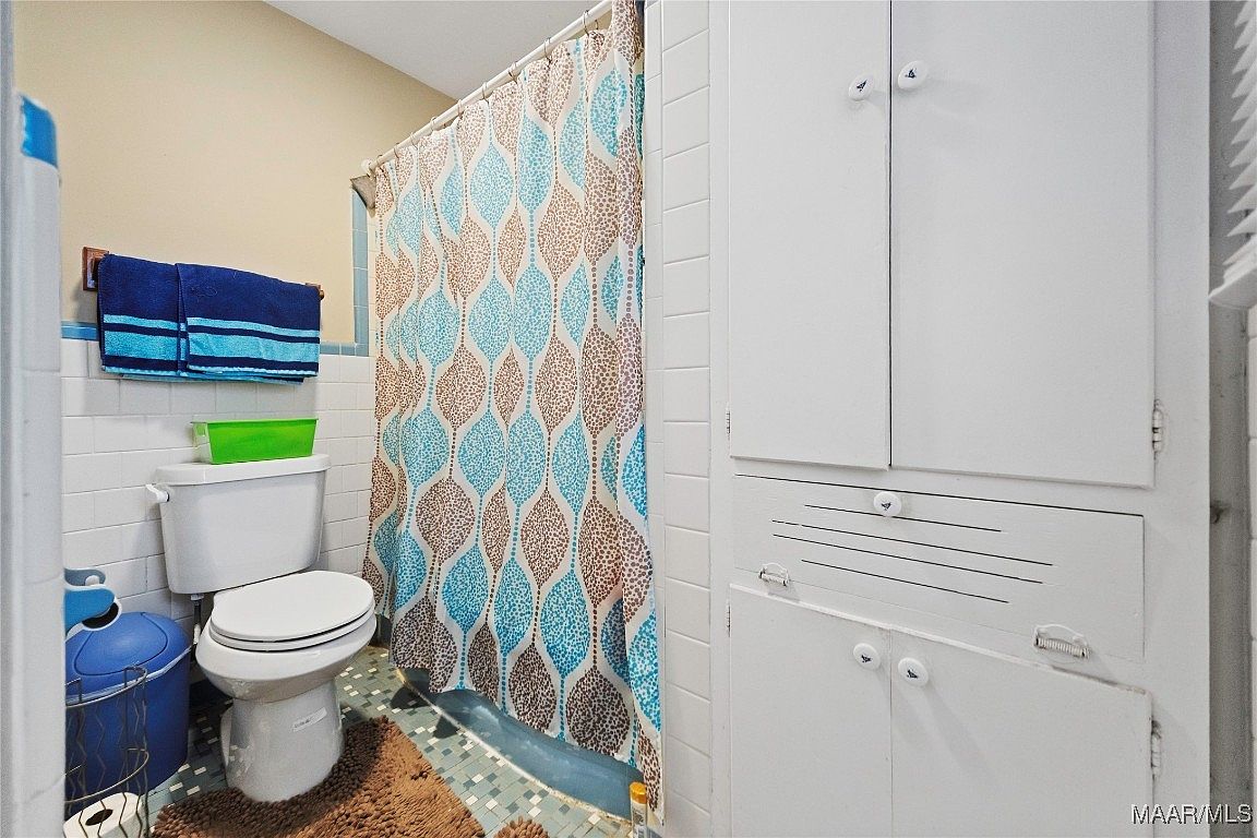 This compact bathroom combines vintage touches with a colorful palette. The lower half of the walls are tiled in white with a thin blue trim, complementing the light beige upper walls. A patterned shower curtain with large leaf shapes in blue and brown hues adds visual interest and ties into the blue mosaic tile floor. A white toilet sits adjacent to a blue trash bin and a brown plush rug, enhancing warmth. White built-in cabinets with traditional knobs offer storage, maintaining a tidy and functional space. Navy and turquoise towels on a wood-accented rack complete the coordinated look.