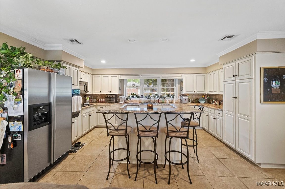 This spacious kitchen features a large central island with a polished granite countertop, providing ample workspace and seating for four with metal-framed stools featuring cushioned seats. The cabinetry is off-white with traditional panel detailing, complemented by dark hardware that adds contrast and sophistication. The walls are painted a warm beige, blending smoothly with the neutral-toned tiled flooring. Stainless steel appliances, including a double-door refrigerator, add a modern touch. A wide window above the sink floods the space with natural light, while plants on top of the fridge and by the window bring a fresh, lively element to the room’s cozy and functional atmosphere.