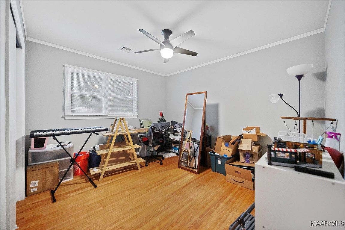 This room serves as a bright, versatile creative workspace with light gray walls complementing the natural warmth of the polished hardwood floor. A horizontal window lets in natural light, boosting the airy feel, while a sleek modern ceiling fan with light enhances comfort. The space is arranged with a foldable keyboard on a black metal stand, a wooden sawhorse-style shelving unit, and a large full-length mirror in a wooden frame leaning against the wall, adding depth. A black office chair sits amidst craft supplies and stacked cardboard boxes, suggesting an active, multi-functional area used for music, art, or projects.