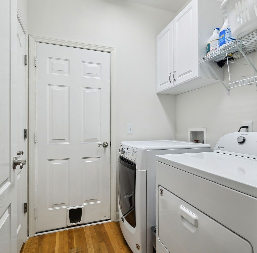 This compact laundry room features a clean and practical design with white walls and cabinetry, creating a bright and airy feel. The room includes a white Whirlpool dryer alongside a modern washer with a sleek black front panel. Above the machines, white cabinets and an open wire shelf provide ample storage for cleaning supplies, contributing to a streamlined and organized space. The natural wood flooring adds warmth and contrast. Two white paneled doors, one equipped with a small pet door, complete the room’s functional layout, emphasizing utility and simplicity.