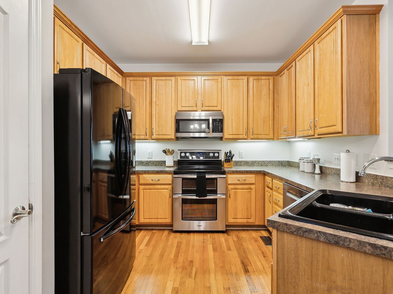This kitchen features a U-shaped layout maximizing counter and cabinet space with natural wood cabinetry that brings warmth and a classic touch. The countertops feature a muted, earth-toned laminate surface that complements the medium wood flooring. Stainless steel appliances, including a large oven with stovetop and an overhead microwave, add a modern contrast while the matte black refrigerator and deep black sink create a cohesive color palette. Under-cabinet lighting brightens the workspace, enhancing both function and aesthetics in the room, making it a practical and inviting cooking area.
