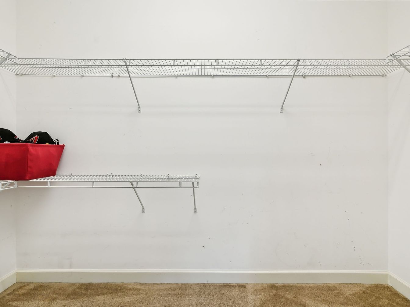 This walk-in closet features a clean, white paint palette contrasting with beige carpet flooring, creating a neutral and calm storage space. Two white wire shelving units dominate the walls; one runs horizontally along the upper portion for storing folded items or accessories, while a smaller, secondary shelf is positioned below on the left side. A red fabric bin containing black baseball caps injects a small pop of color into the otherwise minimalist area. The space evokes simplicity and functionality, designed for efficient organization with ample room for additional clothing, shoes, or storage bins.