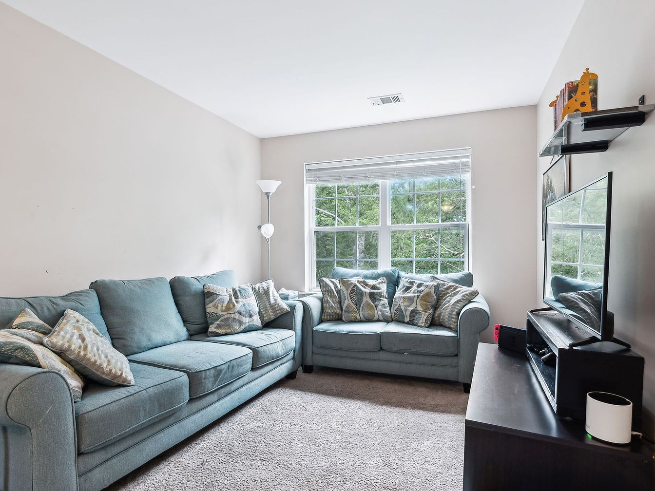 This compact living room corner features two matching teal-blue sofas arranged in an L-shape around a medium-sized window that fills the space with natural light. The walls are painted a soft neutral gray, complementing the plush light brown carpet underfoot. Several patterned cushions in soft earth tones add texture and contrast to the seating. A sleek black TV console holds a flat-screen television and electronic accessories, while a minimalist tiered floor lamp in the corner enhances illumination. The overall aesthetic is simple, inviting, and functional, maximizing comfort in a modest footprint.