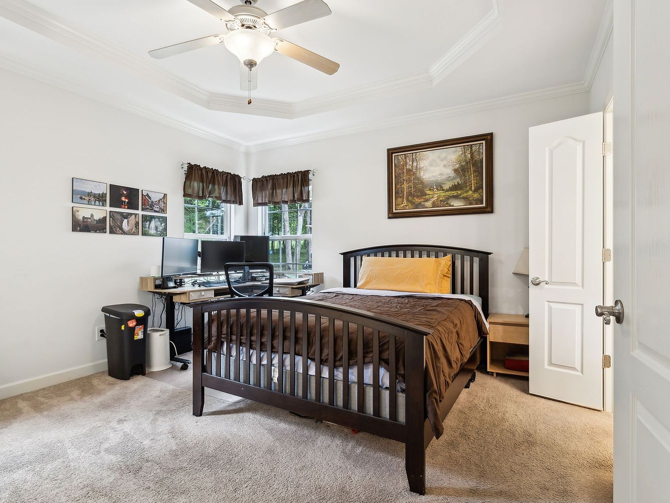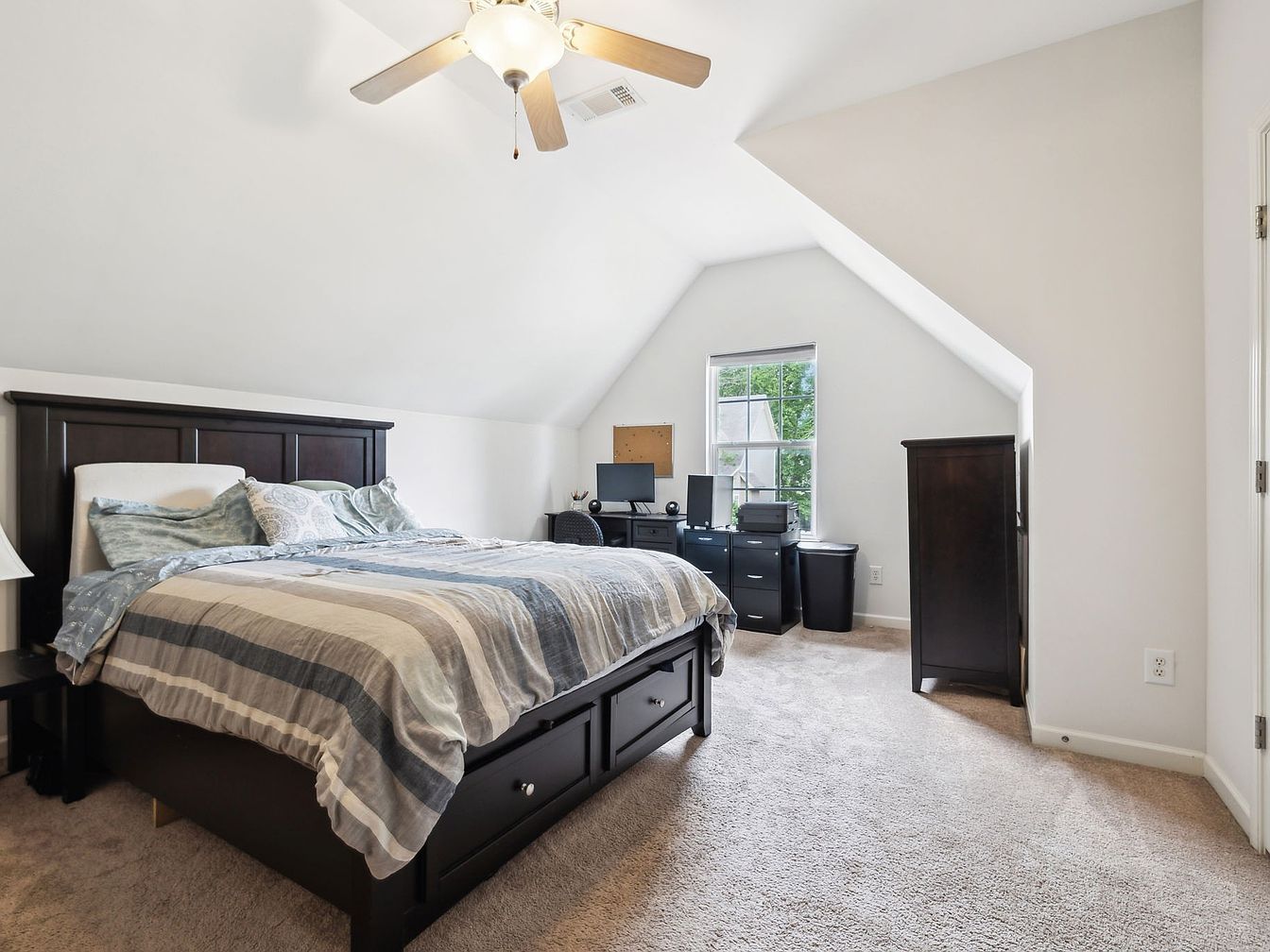 This bedroom features a vaulted ceiling with a ceiling fan, creating an airy and spacious atmosphere. The walls are painted a clean white, complementing the soft beige carpet flooring, which adds warmth to the room. A dark wood bed frame anchors the space, paired with matching nightstands and a chest of drawers positioned near a large window. The window allows natural light to brighten the room and offers views of greenery outside. A compact office area with a black desk, filing cabinet, and computer setup fits neatly under the sloped ceiling, combining functionality with cozy comfort.