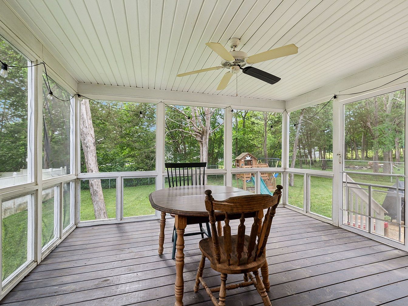 This inviting screened porch offers a serene outdoor dining experience, featuring a rustic wooden table paired with mismatched chairs that add character and charm. The space is framed by white wooden paneling and screens, allowing for unobstructed views of the lush, green backyard and playground beyond. A white ceiling with beadboard detailing adds subtle texture and brightness, complemented by a classic five-blade ceiling fan, designed to provide comfort on warmer days. String lights hang delicately around the perimeter, enhancing the cozy ambiance for evening gatherings. The dark wooden flooring contrasts with the light ceiling, grounding the space elegantly.