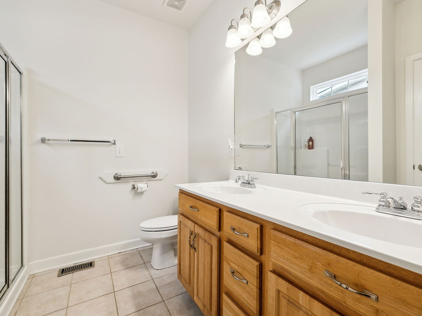 This bathroom features a clean, simple design with white walls and light beige tiled floors that create a bright, airy atmosphere. The vanity includes a long white countertop with dual sinks and polished chrome faucets, accompanied by natural oak cabinetry with brushed nickel handles, adding warmth to the space. Above the vanity, a large frameless mirror expands the sense of openness. Soft, multi-bulb lighting fixtures mounted above provide ample illumination. A glass-enclosed shower with sliding doors is situated beside the vanity, complemented by a high window allowing natural light in. The layout maximizes both functionality and comfort.