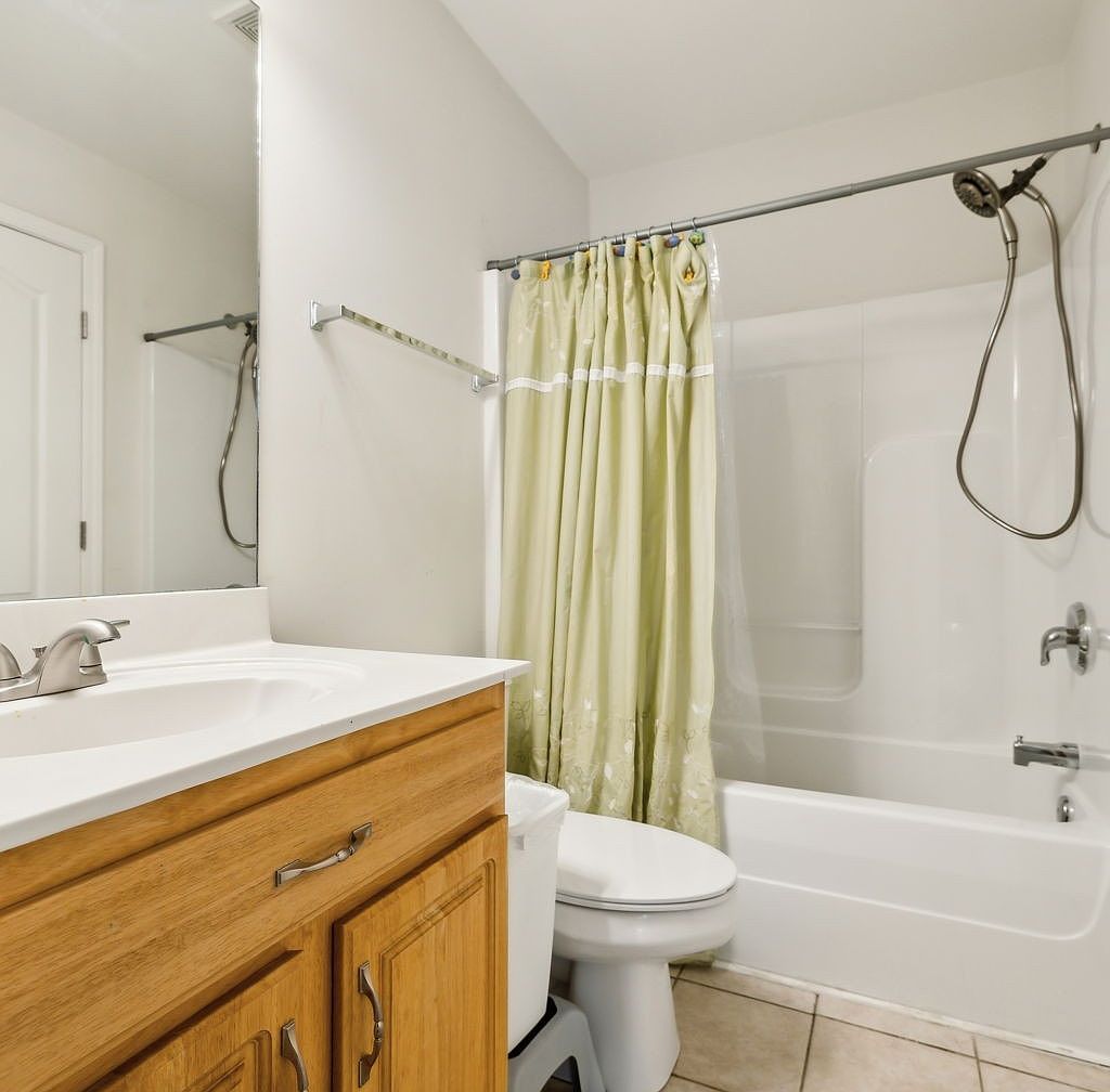 This bathroom blends functionality with simplicity, featuring a compact layout that includes a white tub and shower combination with a brushed nickel handheld showerhead. The walls are painted a soft, neutral white, enhancing the room’s brightness. A light green patterned shower curtain adds a subtle touch of color and texture. The vanity has a natural wood finish with classic cabinet doors and silver hardware, topped with a smooth white countertop and integrated sink. Beige floor tiles complement the warm wood tones while maintaining a clean and inviting atmosphere.
