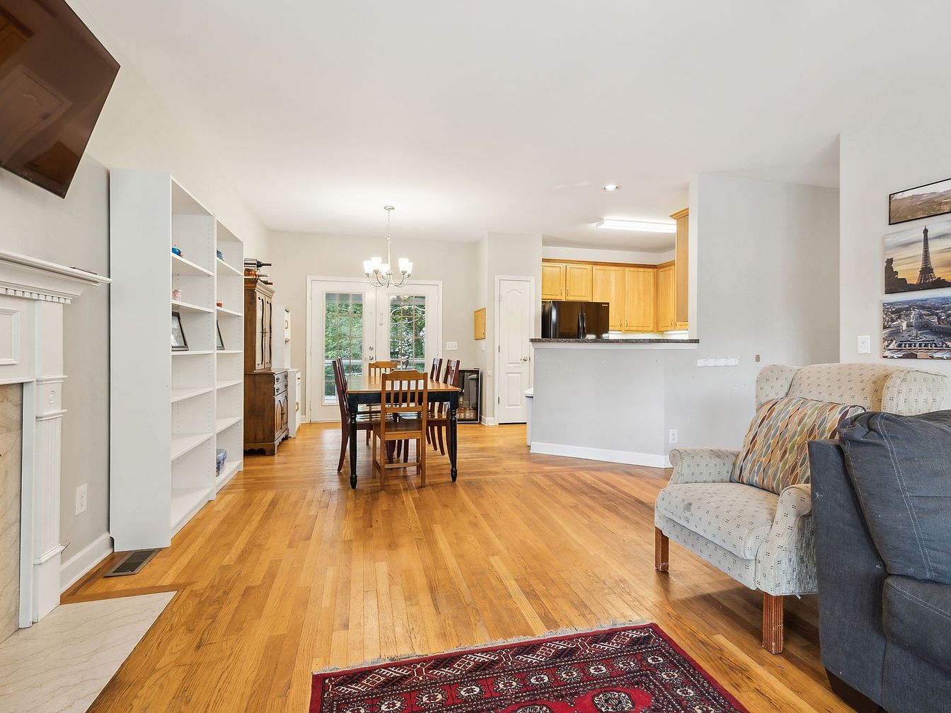 This space showcases an open floor plan combining the living and dining areas seamlessly. Warm honey-toned hardwood floors stretch across the room, enhancing its cozy yet airy feel. A neutral palette dominates, with light gray walls brightened by natural light flowing through French doors that lead outside. The dining area features a classic wooden table with matching chairs under a sleek chandelier, creating an inviting spot for gatherings. To the right, light wood cabinetry lines the kitchen, subtly separated by a breakfast bar. Plush seating with patterned cushions adds comfort while framed travel artworks bring personality to the room.
