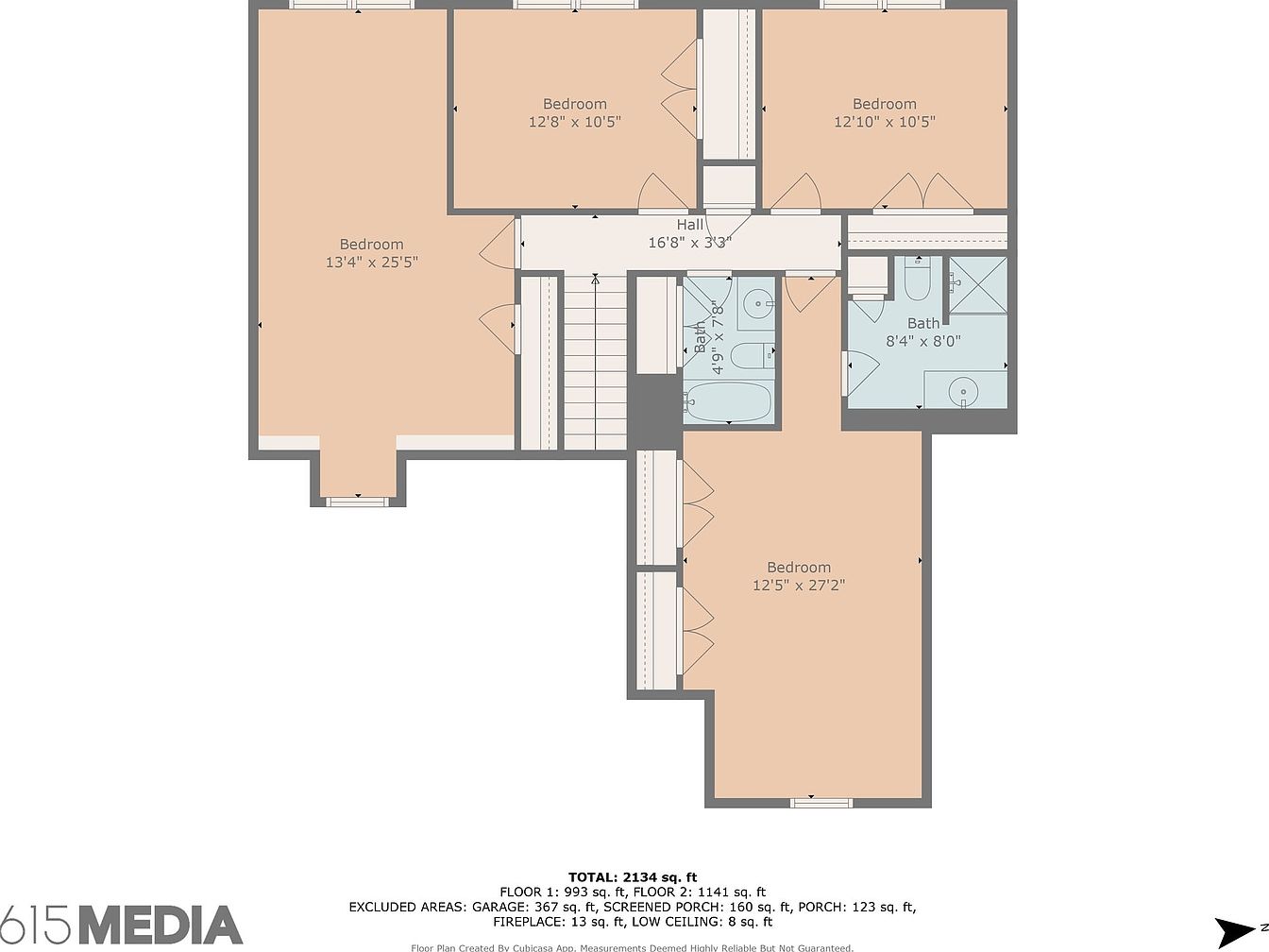 This upper floor features a spacious layout designed primarily for bedrooms and bathrooms. Four bedrooms are arranged around a central hallway that measures approximately 16’8″ by 3’3″, providing access to all rooms. The bedrooms vary in size with the largest measuring 12’5″ by 27’2″ and the smallest around 12’8″ by 10’5″. Two bathrooms are conveniently located adjacent to the bedrooms, each equipped with essential fixtures including a bathtub and shower. Neutral tones dominate the floor plan rendering, emphasizing functionality and fluid connectivity. The staircase at the center signifies connection to the lower level.