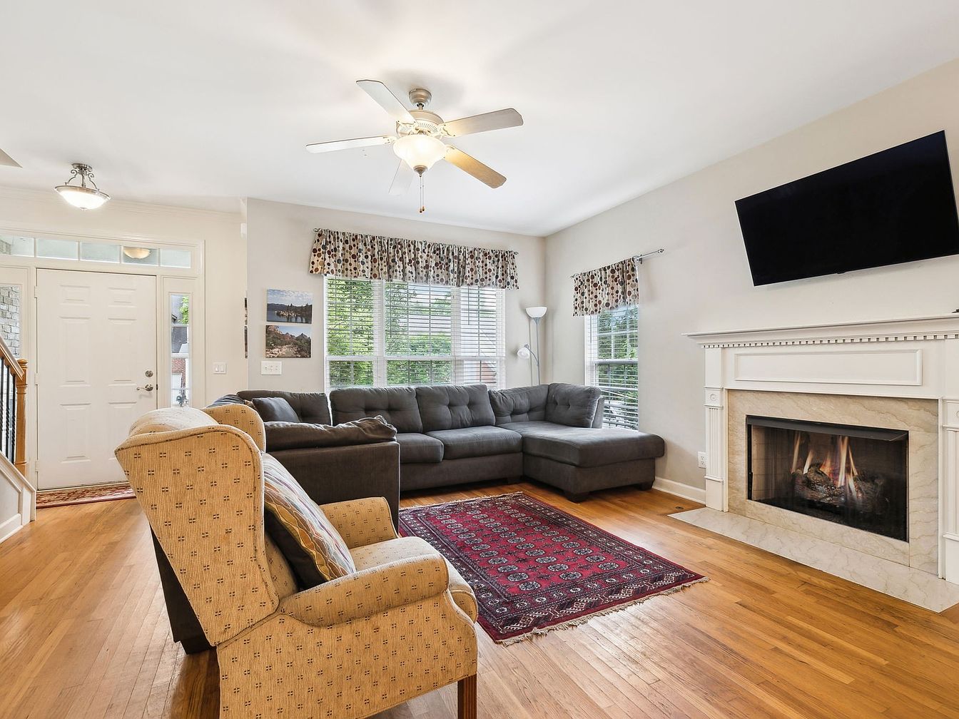 This spacious living room features a warm and inviting atmosphere with a soft neutral color palette dominated by light beige walls and natural wood flooring. A large charcoal gray sectional sofa anchors the seating area, complemented by a patterned beige armchair in the foreground. The room boasts abundant natural light streaming through multiple windows dressed with playful valances in a polka dot pattern. A classic white mantel surrounds the marble fireplace, topped by a mounted flat-screen TV, creating a cozy focal point. The red oriental rug adds a rich pop of color, enhancing the space’s traditional yet comfortable aesthetic. Ceiling and floor lamps complete the layered lighting design.