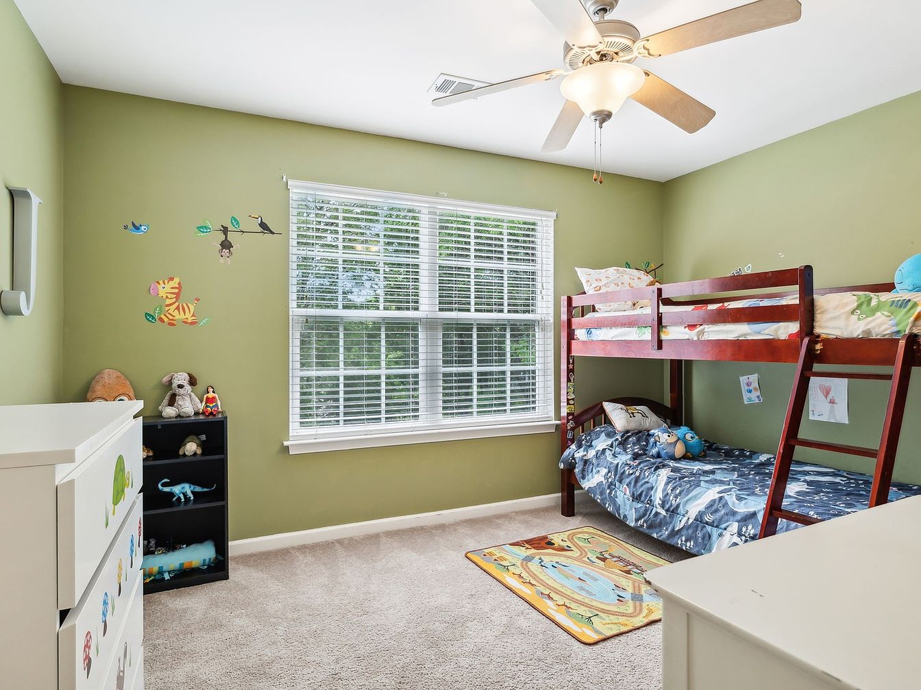 This cozy bedroom features soft green walls that create a calming atmosphere, paired with a plush, light beige carpet that adds warmth to the space. A sturdy wooden bunk bed with a rich reddish-brown finish occupies the corner, complemented by colorful bedding adorned with playful patterns, inviting a sense of fun. The large window, dressed with white blinds, allows natural light to brighten the room, enhancing its cheerful ambiance. A small shelf filled with toys and stuffed animals adds a personal touch, while a small play rug with a map design on the floor encourages imaginative play. The ceiling fan with a soft-glowing light fixture provides both comfort and functionality.