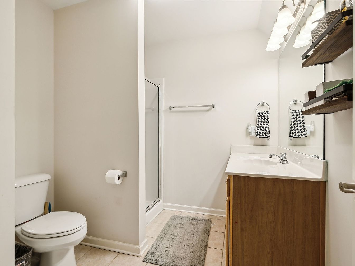 This bathroom embraces simplicity with a neutral palette, featuring light beige walls and matching floor tiles that enhance the room’s brightness. A white toilet sits tucked neatly in a corner next to a partition wall that separates it from the shower area, which is enclosed by glass doors for a clean, modern look. The vanity features a wooden cabinet with a crisp white countertop that integrates a single sink, accompanied by a large mirror that visually expands the space. Practical wooden shelves hold necessities, while black and white houndstooth-patterned hand towels add subtle visual interest. A plush gray bath rug invites comfort and warmth underfoot.