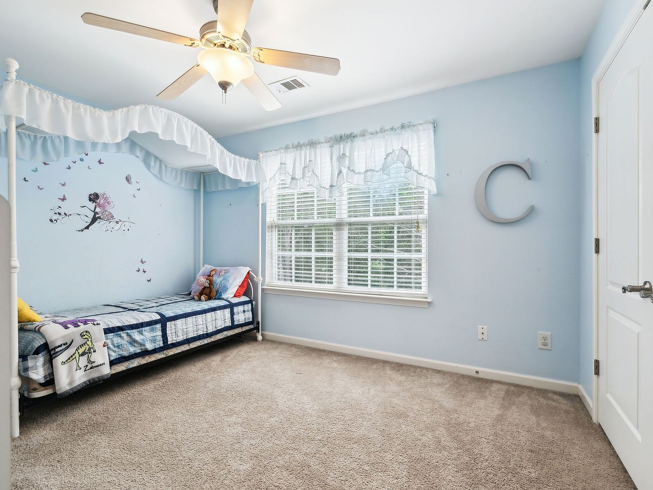 This cozy child’s bedroom features soft blue walls paired with light beige carpet flooring, creating a calm and inviting atmosphere. A white canopy twin bed adorned with a delicate ruffled valance is positioned against one wall, complemented by playful bedding and stuffed animals that add warmth. The large window lets in abundant natural light filtered through sheer white curtains with gentle ruffles, enhancing the airy feel. A ceiling fan with a light fixture centers the ceiling, while a gray letter “C” on the wall personalizes the space. The overall design is simple, cheerful, and child-friendly.