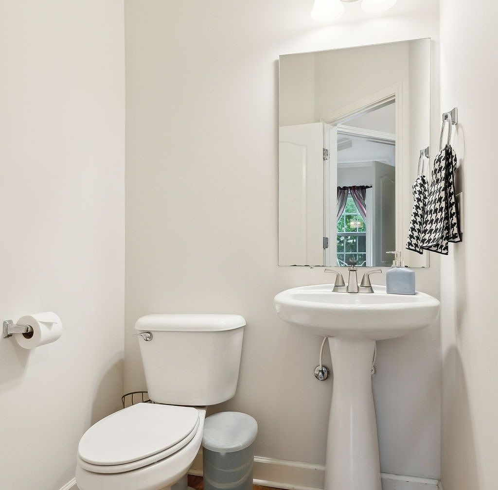 This compact powder room offers a clean and minimalist design with white walls and classic white porcelain fixtures. A pedestal sink with a sleek modern faucet stands beside a standard toilet, maximizing the use of limited space. Above the sink, a large, simple rectangular mirror reflects natural light that filters in from an adjacent room, enhancing brightness. The contrast is subtly accentuated by the black-and-white houndstooth hand towels neatly hung on a chrome ring next to the sink. The overall aesthetic is fresh and functional, focusing on simplicity and cleanliness.