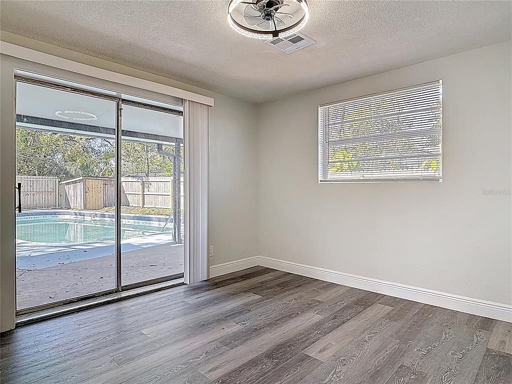 This bright, unfurnished room features light-colored walls and dark wood-look flooring that adds a modern touch. A sliding glass door provides direct access to a covered patio and a fenced backyard swimming pool area, allowing seamless indoor-outdoor living. Natural light streams in through both the sliding door and a window fitted with blinds on the adjacent wall. The ceiling includes a contemporary fan with a built-in light fixture, enhancing air circulation. Clean white baseboards add a subtle contrast to the walls and flooring, completing this versatile space ideal for a bedroom or office.