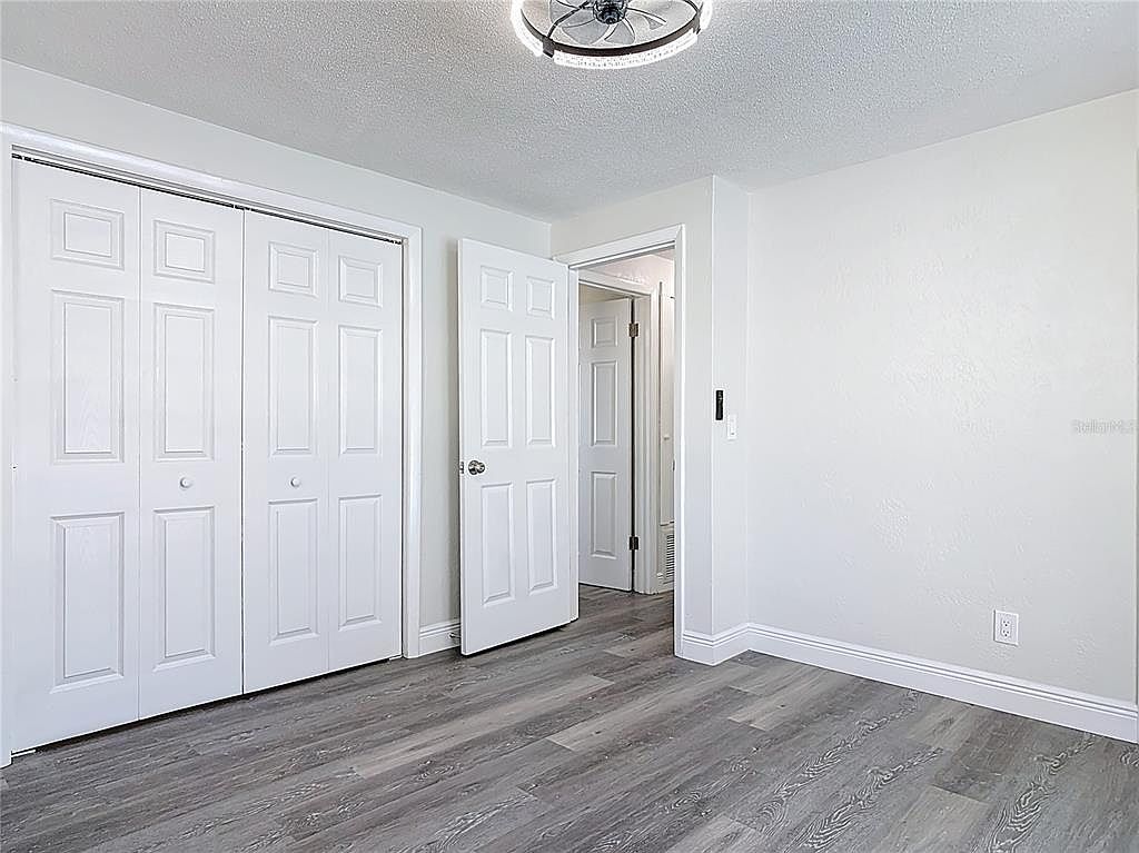 This bright bedroom features a clean and minimalist design with crisp white walls and trim that reflect natural light, enhancing the room’s airy feel. The flooring is a modern, wood-like laminate with varied gray and brown tones, adding warmth and texture. A pair of white paneled closet doors occupy one wall, offering ample storage while maintaining the streamlined look. The entrance door, also white with polished chrome hardware, complements the overall palette. The ceiling light fixture introduces a contemporary touch with its circular design and integrated fan, blending style with function.