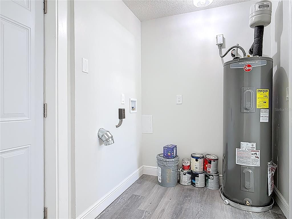 This compact utility space features a clean and functional design with light gray walls and complementing gray-toned wood flooring that adds a modern touch. A large Rheem water heater stands prominently in the corner, emphasizing the room’s practical purpose. Near the wall, multiple paint cans and a large bucket suggest recent or upcoming maintenance activities. Essential hookups and electrical outlets are present on the walls, indicating facilitation for laundry appliances. The white door with classic paneling and the simple ceiling light fixture complete this well-organized service area focused on efficiency and utility.