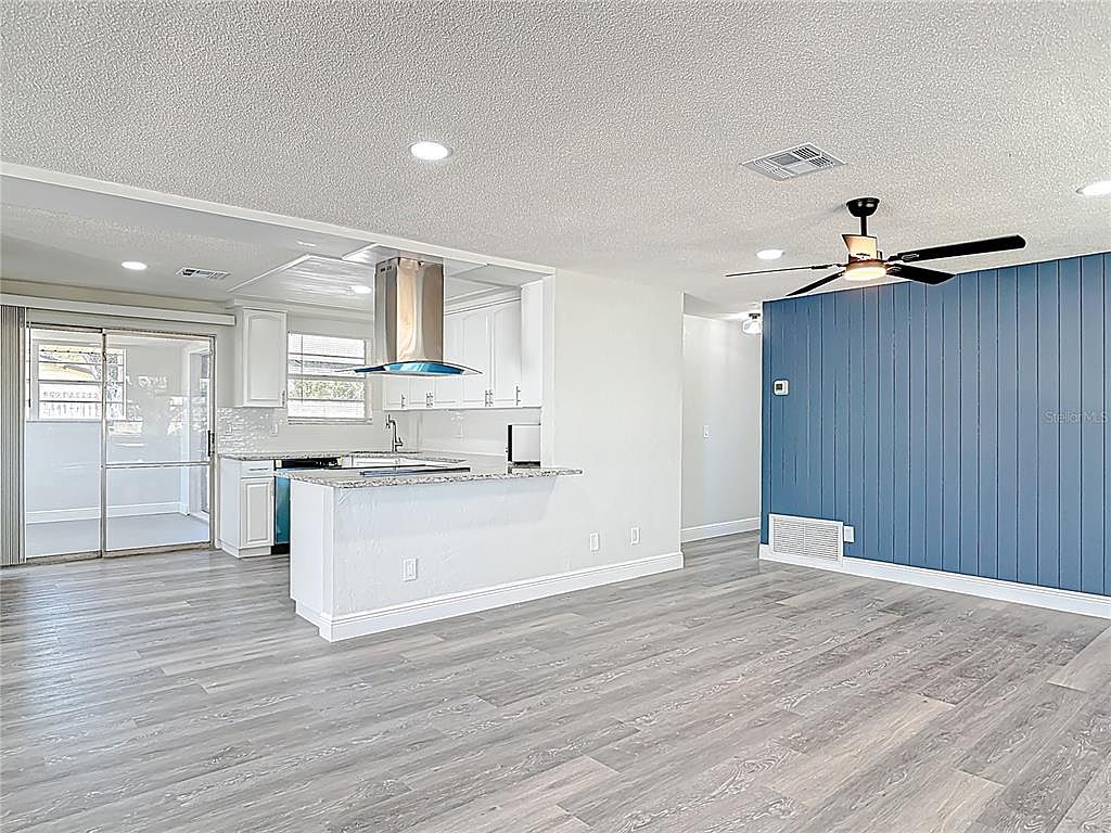 This space features a seamless open concept layout combining the kitchen and living area, highlighted by light grey wood flooring that adds warmth and texture. The kitchen boasts white cabinetry paired with a granite countertop island that includes a contemporary stainless steel range hood, serving as a focal point. Recessed lighting brightens the space, complementing natural light from windows and a sliding glass door leading to an enclosed patio area. A bold navy blue accent wall with vertical paneling and a modern black ceiling fan introduces contrast and depth, enhancing the room’s fresh, airy, and inviting aesthetic.
