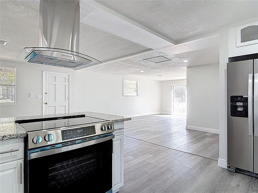 The space features a bright and airy open-concept design with a seamless flow between the kitchen and living area. The kitchen boasts a modern stainless-steel electric stove with a sleek glass cooktop and an overhead curved stainless steel vent hood that adds a contemporary touch. White cabinetry contrasts with speckled granite countertops to achieve a clean and refined look. The flooring throughout is a light gray wood laminate, extending into the living area for a cohesive feel. Neutral-colored walls and ceilings create a fresh, spacious atmosphere, complemented by recessed lighting and natural light from multiple windows and a sliding glass door.