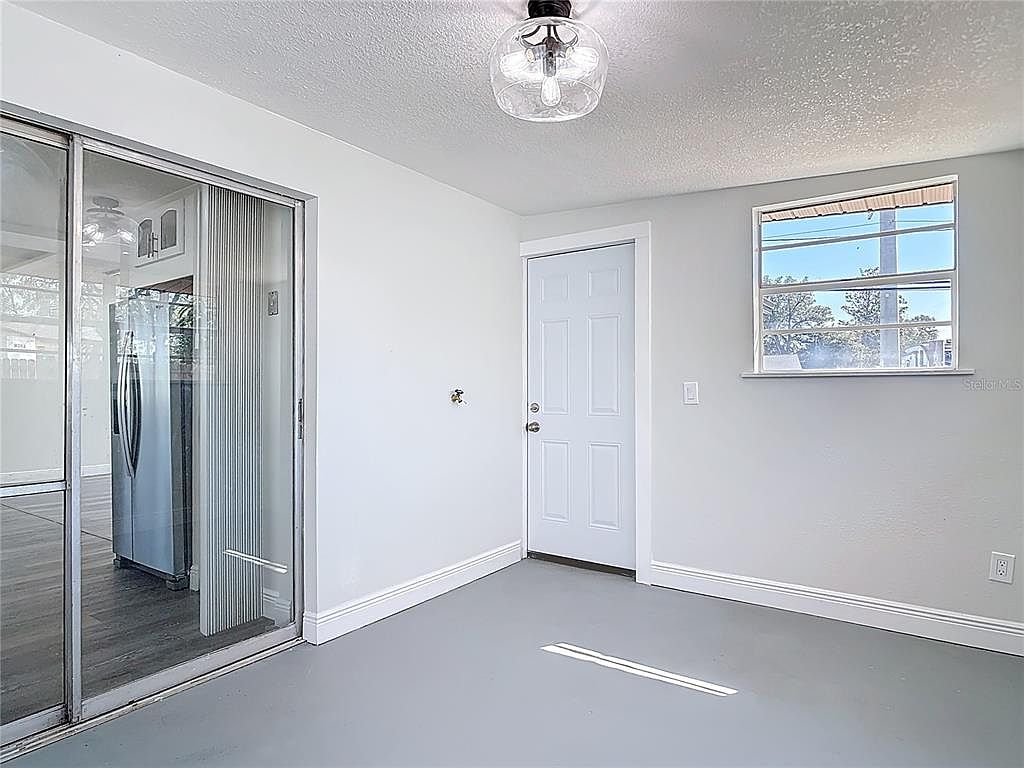 This clean and bright utility area features a minimalist design with smooth light gray floors and white walls, creating a neutral and airy atmosphere. The space is well-lit by natural light streaming through a simple rectangular window with divided panes. A white door provides access to an adjacent room or the outdoors, maintaining the understated color palette. On one side, sliding glass doors with vertical blinds open into a kitchen or dining area, where a stainless steel refrigerator is partially visible, offering a modern contrast to the serene utility space. A clear glass ceiling light fixture adds a subtle contemporary touch.