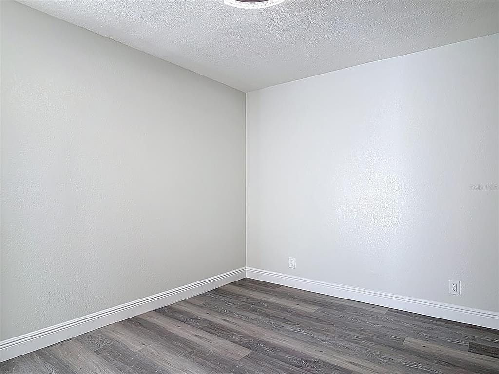 This corner of the room features a clean, minimalist design with light gray walls that enhance natural light reflection, creating an airy and spacious feel. The floor is covered in wide, gray-toned wood laminate planks, offering a modern and durable surface that complements the neutral tone of the walls. White baseboards add a crisp boundary between floor and wall, creating a polished finish. Two electrical outlets along the base of the wall ensure practicality. The ceiling has a textured finish, adding subtle visual interest without overwhelming the simplicity of the space.