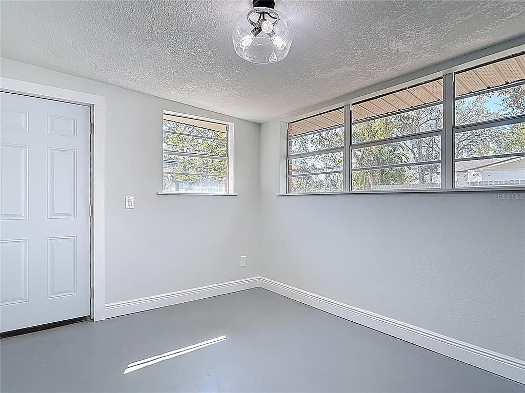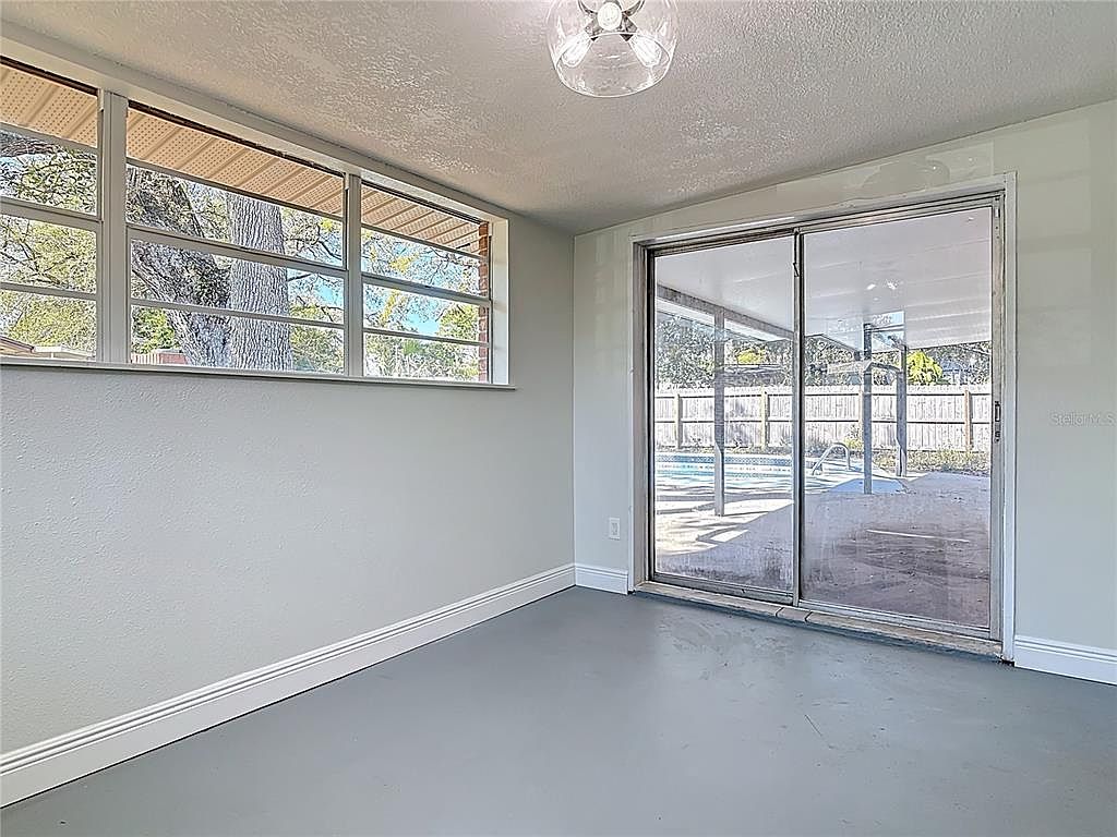 This bright sunroom offers a seamless indoor-outdoor transition with large sliding glass doors opening to a covered patio and pool area. The space features a cool, neutral color palette with soft grey flooring that complements the light, muted walls and white baseboard trim for a clean, airy atmosphere. The horizontal windows high on the wall bring in additional natural light while preserving privacy. The ceiling fixture adds a touch of modern elegance, making this versatile area perfect for relaxation or casual gatherings while enjoying views of the backyard oasis.