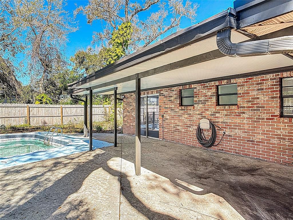 This outdoor space features a practical covered patio with a solid roof supported by black metal posts, creating a shaded area perfect for relaxing or entertaining. The flooring is a neutral-toned concrete slab, blending seamlessly with the red brick exterior wall of the house, which adds warmth and texture to the setting. Attached to the brick wall is a neatly coiled garden hose. Adjacent to the patio is a modest in-ground pool bordered by light blue and white tiles, offering a refreshing focal point. Surrounded by a wooden privacy fence and mature trees, the area feels inviting and private, making it an ideal backyard retreat.