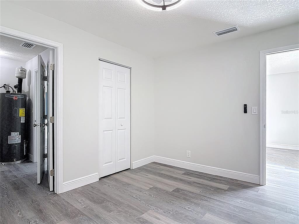 This space serves as a transitional area leading to a utility room, evident by the visible water heater behind an open door. The neutral color palette features light gray walls paired with white trim and doors, creating a clean, modern ambiance. The floor boasts wide plank wood-look laminate in varying shades of gray that add subtle texture and warmth. Architectural details include simple baseboards and a contemporary flush ceiling light fixture. A small double-door closet adds functional storage space. The room offers access to adjacent living areas through a doorway, maintaining an open circulation while preserving utility privacy.