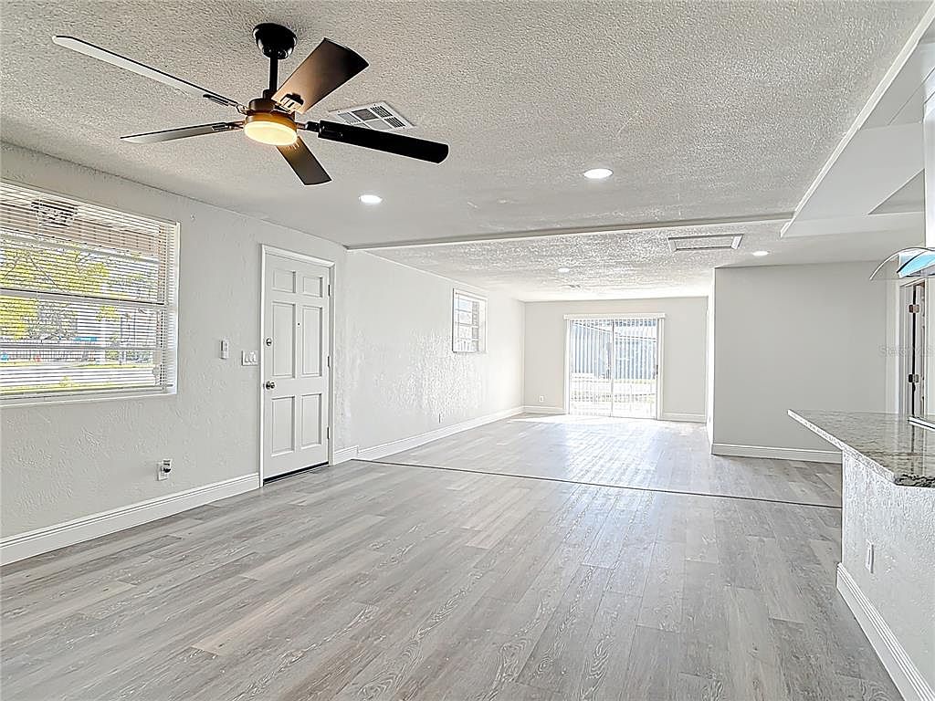 This spacious open living area features a modern, neutral color palette with light grey wood-effect flooring and soft white walls that enhance the natural light streaming in from multiple windows. The space is elongated, leading toward a sliding glass door that opens to an outdoor area. A sleek black ceiling fan with integrated light provides functional modernity to the ceiling, which is dotted with recessed lighting. White trim and simple baseboards offer subtle architectural details, while a granite countertop with a breakfast bar subtly defines the transition to the kitchen area, emphasizing clean lines and an inviting flow.