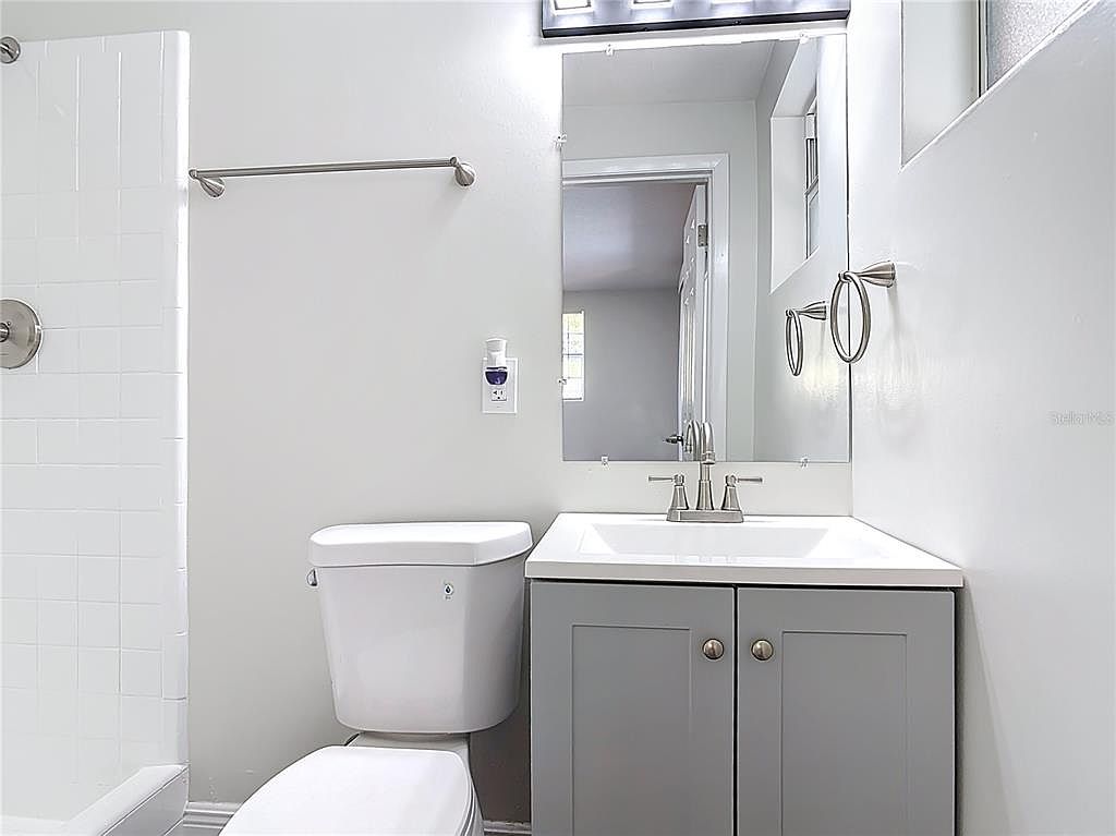 This bathroom features a clean and modern design with a subtle color palette centered around soft grays and whites. The white toilet sits adjacent to a gray vanity cabinet topped with a sleek white countertop and an integrated sink. Above the vanity is a large frameless mirror that reflects light, enhancing the bathroom’s spacious feel. Brushed nickel fixtures, including the dual-handle faucet, towel ring, and towel bar, provide a cohesive metallic accent. The white tiled shower wall to the left adds texture while maintaining the room’s bright and fresh aesthetic. The space exudes simplicity and functionality.