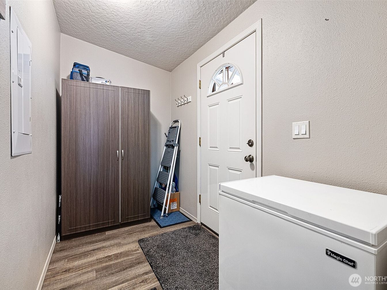 This compact entryway features practical storage solutions and a neutral color palette that creates a clean, organized feel. Light beige walls and a textured ceiling complement the medium-tone wood laminate flooring, extending warmth to the area. A white door with a semi-circular window brightens the space while providing privacy. Against one wall, a sleek, modern dark wood wardrobe offers ample concealed storage, flanked by a multi-step ladder and a few compact items, enhancing functionality without clutter. A textured gray mat anchors the white Magic Chef freezer chest, ensuring the space remains both tidy and useful.