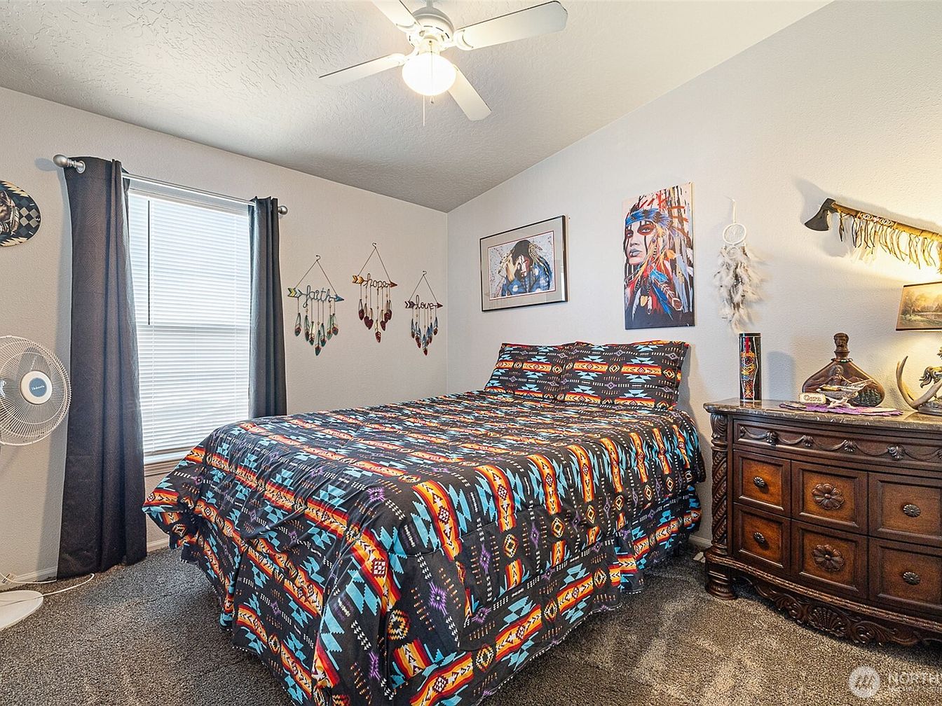 This intimate bedroom corner features a vibrant Southwestern-inspired bedding set with bold geometric patterns in black, turquoise, orange, and red. The walls are painted a soft, neutral white, creating a bright contrast to the colorful textiles. Native American artwork and decorative elements, such as feather wall hangings and a rustic wooden chest of drawers, emphasize cultural and handcrafted aesthetics. A window with dark curtains allows natural light to filter in, while a simple white ceiling fan adds functionality. The room’s carpet is plush and dark-toned, enhancing overall warmth and comfort.