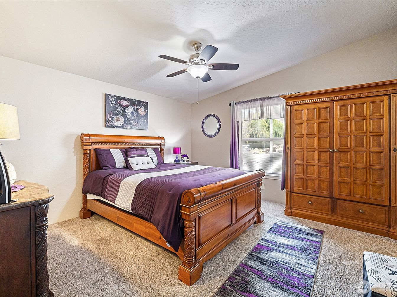This master bedroom features a warm and inviting design with a strong emphasis on rich wooden furniture, including a robust bed frame and a spacious armoire with detailed paneling. The bed is adorned with purple and lavender bedding, complemented by a matching area rug that adds texture and color to the neutral beige carpet flooring. A ceiling fan with a light fixture centers the room, while a window with light lace curtains and purple drapes allows natural light to brighten the space. Decorative elements include a floral wall painting above the headboard and a circular mirror, adding a touch of elegance and coziness.