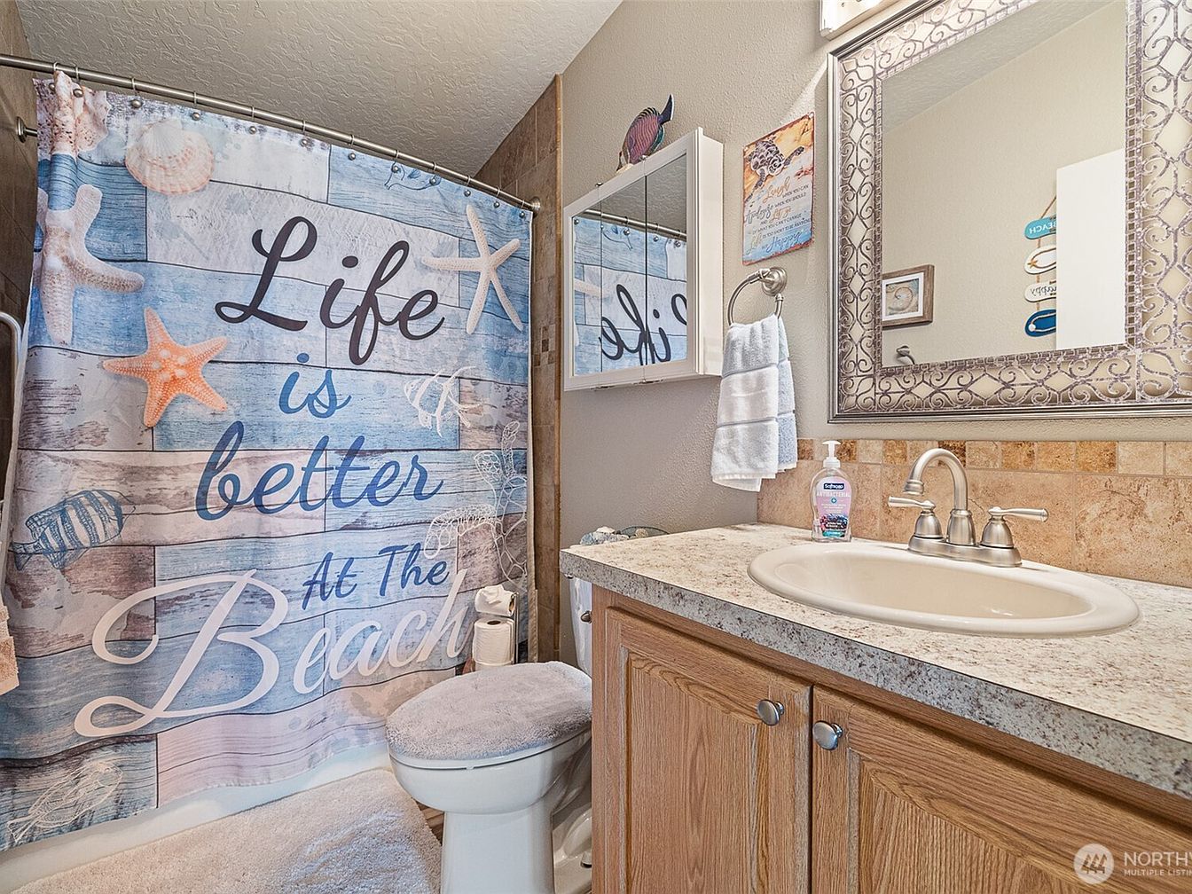 This cozy bathroom embraces a charming beach motif with a shower curtain declaring, “Life is better at the Beach,” adorned with starfish and sea shells on a weathered wood background. The vanity features a speckled countertop paired with a beige oval sink and silver faucet. Light oak cabinetry offers warmth against neutral walls and mosaic backsplash tiles. A decorative mirror with an intricate silver frame hangs above the sink, reflecting soft lighting. A white and blue hand towel complements the coastal colors, while a plush toilet seat cover and matching bath mat add comfort and softness to the space.