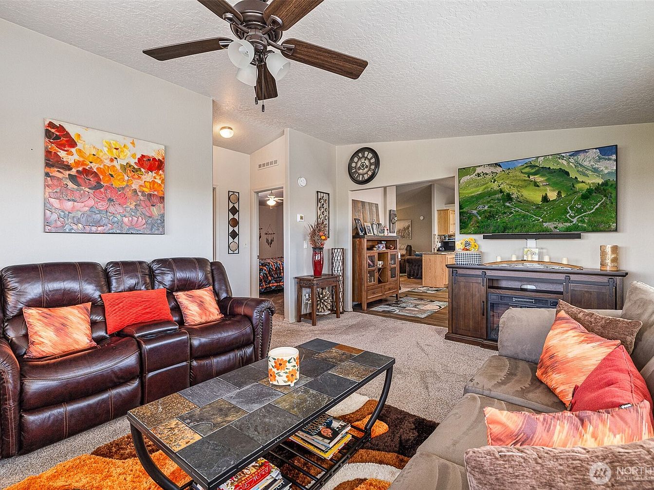 This cozy family room features a well-balanced layout with two sofas facing each other, one dark brown leather with orange and red accent pillows, and the other a soft taupe fabric also adorned with vibrant pillows. A rectangular stone-tiled coffee table sits centrally on a plush area rug blending orange, brown, and beige tones. Neutral beige carpeting covers the floor, complementing the light walls. A ceiling fan with dark wood blades adds functionality and style overhead. A mounted flat-screen TV hangs above a dark wooden media console with a built-in electric fireplace, while decorative artwork and accents personalize the space, fostering a warm, inviting atmosphere.